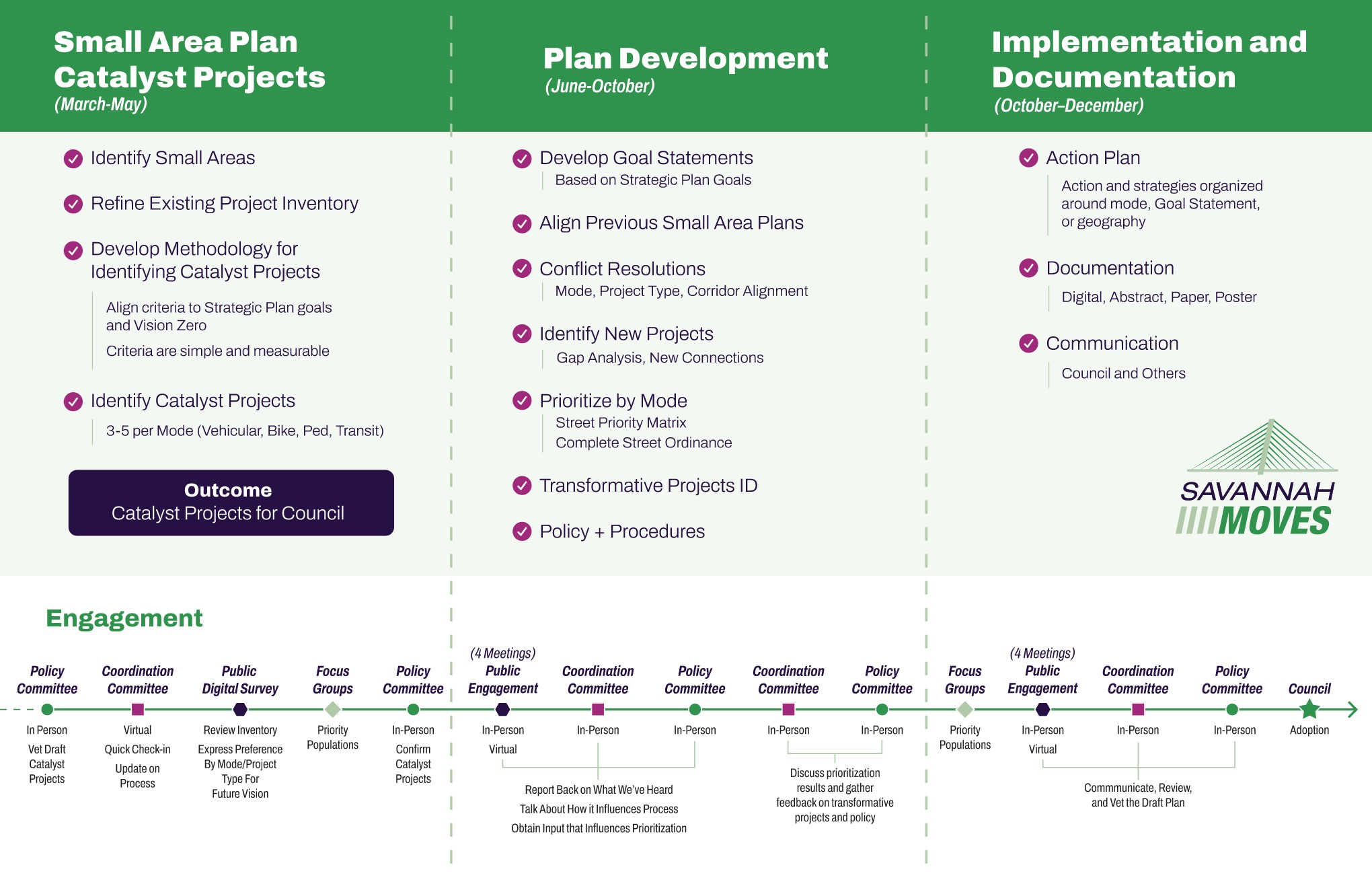The engagement process will follow the planning process through three phases – Small Area Transportation Plans, Savannah MOVES Plan Development, and Implementation and Documentation. The graphic on the following page illustrates how community engagement will be interwoven with the plan development.